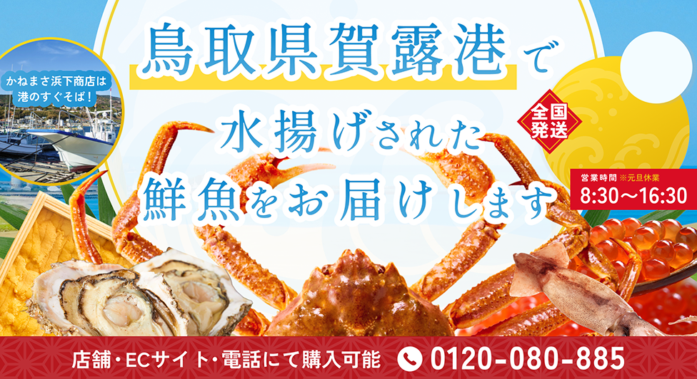 港から徒歩わずか50歩に位置するお店から、その日採れた新鮮な松葉ガニを即日お客様にお届けできるよう心掛けております。
